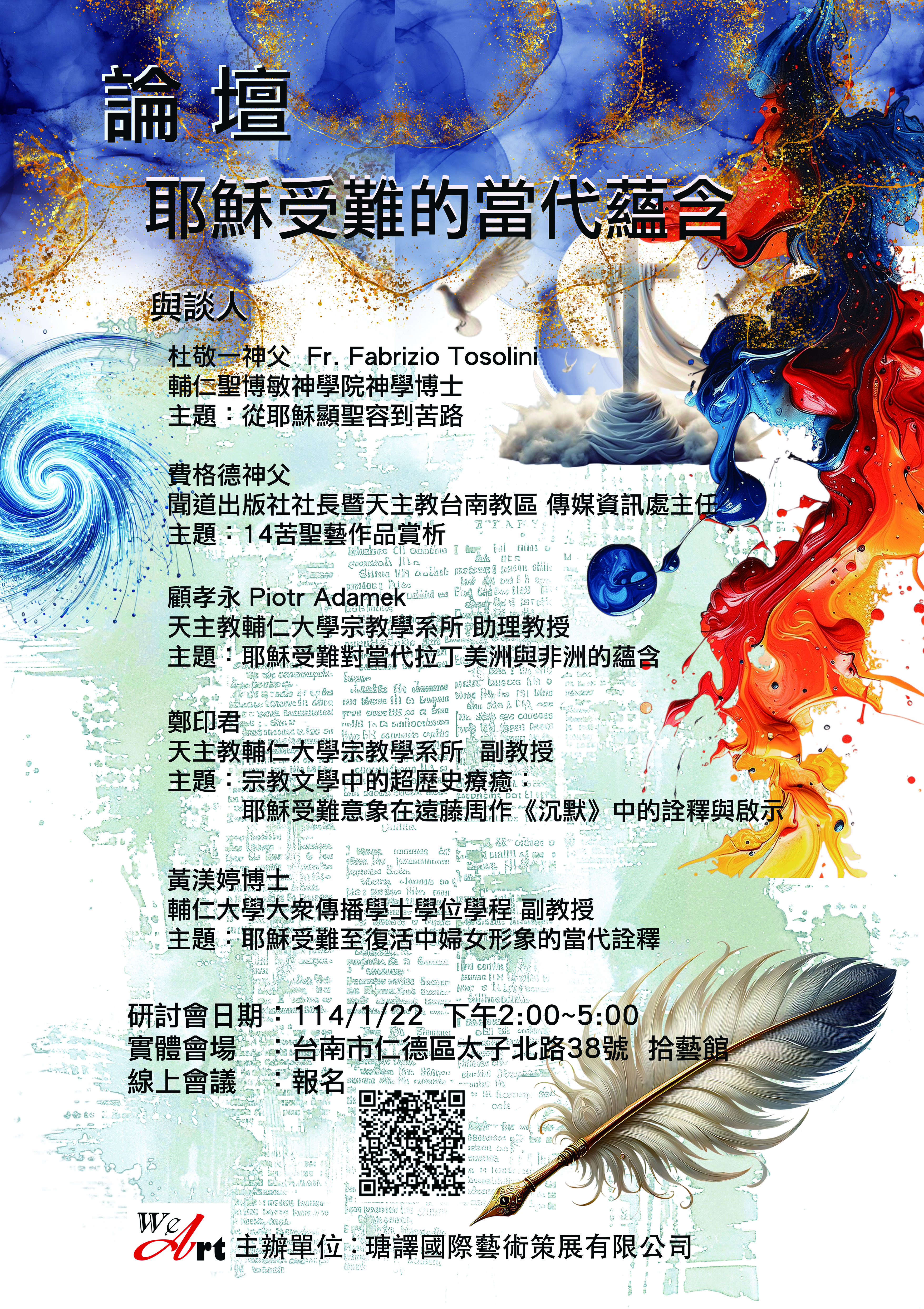 論壇-耶穌受難的當代蘊含耶穌受難 (Passion of Christ)。這對基督徒來說是一個非常核心的信仰內容,特別是在紀念耶穌為世人贖罪而受苦、被釘十字架的救贖行動。